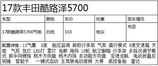 2017款丰田兰德酷路泽5700整车配置丰富豪华,在我国的东北、内蒙、新 疆、西藏等地,拥有极高的保有量;2017款丰田兰德酷路泽5700是一款备受越野族青睐的大型SUV,健壮的车身,粗犷的线条,宽敞的 空间,强劲的动力,无一不彰显丰田家族SUV的魄力和风范。