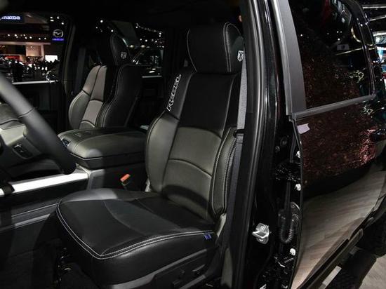 前脸部分,没有采用道奇一贯的十字形进气格栅设计,反而采用哑光黑的塑料材质,下方银色的金属防擦挂护板与上方格栅造型上相呼应,使其看上去更加坚固稳当,保险杠两侧还有两个粗壮的拖车钩。引擎盖上隆起的线条彰显肌肉感,两侧大灯组采用LED光源设计。