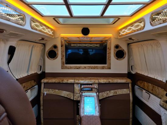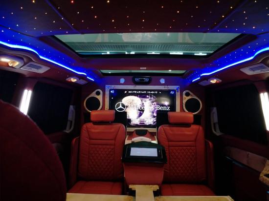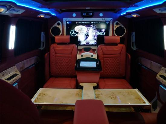 奔驰V260内饰篇:贵宾舱从 车外初窥,一个明显感受就是扑面而来的古典奢华气息,奔驰商务车经典的7座格局得以保留,前后双段式全景天窗,向车内提供充足的采光条件,为进一步追求私 享静谧,经隔音防噪处理的加固车身结构,配备墨色车窗,内置电动百褶窗帘 ,后舱的整体风格也采用了和驾驶舱相溶的基调,萦绕车壁、车顶的麂皮绒绝对称得上是大手笔,座椅扶手及侧边车壁也不乏钢琴烤漆纹饰装点