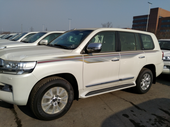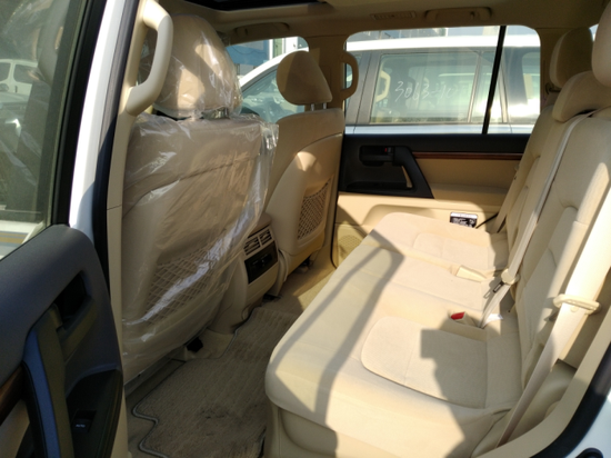 17款中东版丰田酷路泽4600配置:遥启、智能卡、天窗、冰箱、2气囊、桃木方向盘、桃木内饰、一键启动、双差、后电眼、6喇叭、定速巡航、前小杠、前雾灯、氙灯+LED、电动调节后视镜、镀铬车身防护条、后尾翼、挡泥板、车身彩条、底挂备胎、后拖钩、灭火器、丝绒座椅、双区独立空调、主驾驶电动调节座椅、18轮。