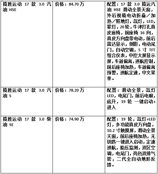 配置方面:路虎揽胜运动版铝制车身的线条优雅大方且和谐匀称。全新的进气格栅让前脸部分看上去更为内敛含蓄。路虎揽胜运动版后泊车影像功能通过使用车辆后部的雷达探测器,该系统可警示 驾驶者在倒车时的潜在碰撞。新车的恒时四驱系统,可选择高低档,提供卓越的公路驾驶和越野性能。