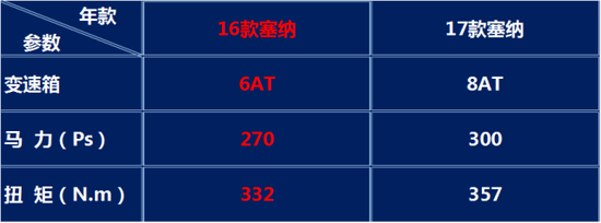 17款塞纳与16款塞纳外观上一模一样。17款与16款最大的差异在于变速箱,17款升级为8速变速箱,马力同时提升了30Ps,扭矩同时提升了25N.m。