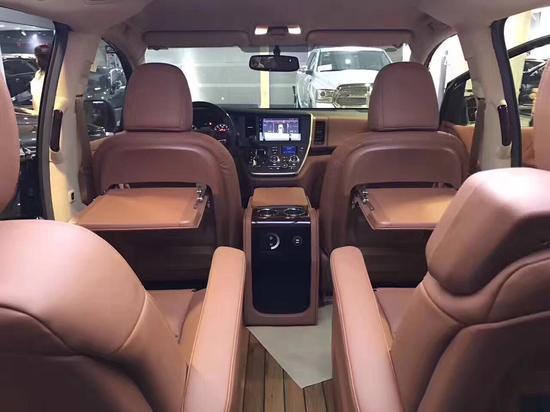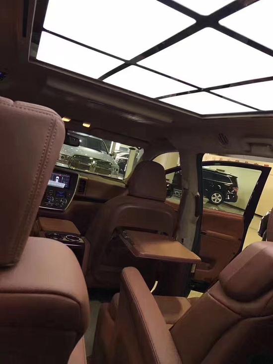 17款丰田塞纳 | 电议有优惠 | 电议 | 华荣版,塞纳四驱改装版, 配置: 运动大包围; 双侧电动门; 前排座椅加热; 第二排座椅通风加热按摩; 第二排小桌板; 三区空调; 倒车影像; 后排隐私玻璃; 多功能方向盘; 定速巡航; 行李架; 间歇式雨刷; 电动折叠后视镜; 蜂窝中网; 全车镀铬装饰套件; 18寸轮毂; 远近光一体式LED大灯 全车真皮座椅; 打孔真皮+钢琴烤漆实木方向盘; 真皮中控台; 五门真皮; 翻毛皮内顶; 木质地板; 暗夜星空顶及氛围灯; 迎宾踏板及全车氛围灯; 折叠式行政桌板; DVD后排娱乐系统; 内置12L 温控冰箱中央扶手箱; 电动后尾门…… | 改装部件享一年质保! |