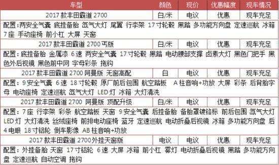 目前,天津愿景浩翔汽车贸易有限公司现车在售17款丰田霸道2700,颜色主要以(黑色/白色/等等)为主。购车可优惠万元。丰田霸道2700无论是“越野舒适”的开发理念,还是“智能现代”的设计核心,都让焕然一新的新车又一 次成为了文武双全的市场标杆。对这款车感兴趣的朋友们不妨进一步关注一下。