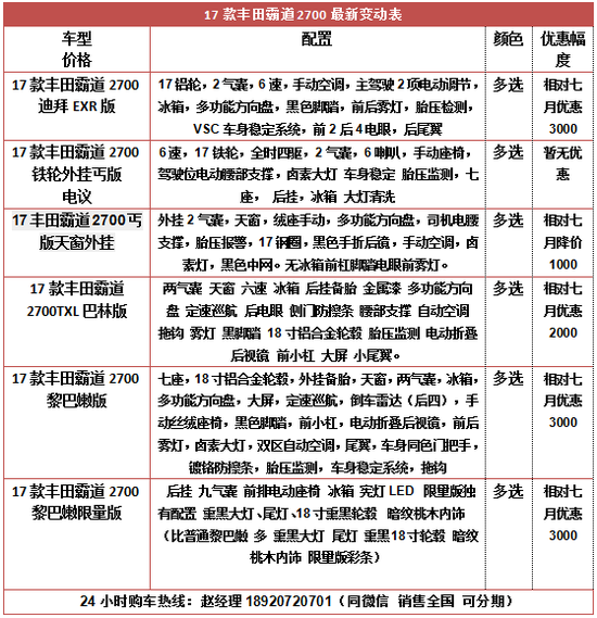 近日获悉,全新款丰田霸道2700大批到港,普拉多 (配置|询价)畅销行情,新款霸道野性叛逆,抄降底价巨献。丰田霸道2700面对越来越大、越来越丰满的车型设计,车尾显得很俊俏、灵动。自由豪放地体验无与伦比的顶级驾乘感受,方向于指掌中潇洒掌控,尽展都市SUV的不羁动力,强劲的扭矩输出也有助于它应对恶劣的路况。感兴趣的朋友不妨拨打购车咨询热线:18920720701赵经理(同微信)(可售全国 随时看车 当日提车 详情电询)