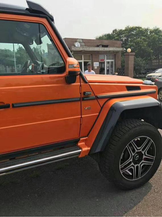 17款奔驰g500采用AMG车型特有的轮拱饰条、不锈钢迎宾踏板以及不锈钢防擦条,挡泥板上的“V8 BITURBO”标识以及后门上的“G500牌也十分醒目。
