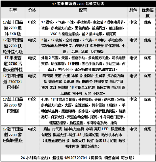 近日获悉,目前天津愿景浩祥汽车销售有限公司2017款丰田霸道2700大量促销现车在售,颜色可供选择。丰田霸道2700之所以可以无所畏惧的一路前行,靠的就是那永垂不朽的越野天赋和使命。对这款车感兴趣的朋友们不妨关注一下。具体价格请详见下表,购车咨询热线:18920720701赵经理(同微信)(可售全国 随时看车 当日提车 详情电询)