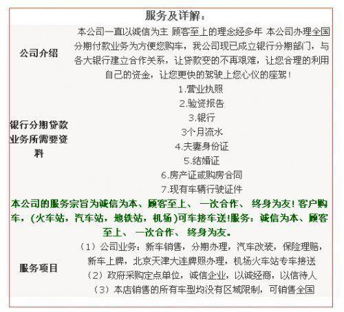 店内车辆关单、商检齐全 ,当日提车,全国购车皆可办理分期付款。感兴趣的朋友不防进店了解详情:全国购车皆可办理分期付款。更多优惠促销请致电天津佳世鹏程国际贸易有限公司。