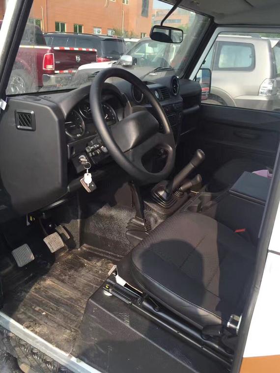 路虎卫士加入了一些现代感,前灯由原来的圆形设计变成了组合式的椭圆造型,Led行车灯也被设计在前保险杠上,应该说前脸有几分神行者2的风格。黑色的真皮赛车座椅设计别具特色,皮质手感非常顺滑,方方正正的安装在驾驶室里。