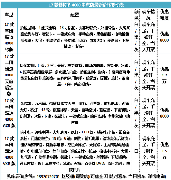 近日在天津愿景浩祥汽车销售有限公司获悉,2017款丰田霸道4000现车到店,中东版普拉多 (配置|询价)配置耀眼,天津现车销售优质座驾享高额优惠,超值爆惠限时秒杀。2017款丰田霸道4000纯正越野利器换了一副全新的面孔重新示人。位于保险杠两侧的圆形雾灯也更加的简洁、直观。拥有那仿佛钢铁侠一样的夺人的眼神,高调完美的肩负越野性能和公路性能。购车咨询热线:18920720701赵经理(同微信)(可售全国 随时看车 当日提车 详情电询)