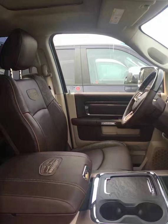 17款道奇公羊长角号高度外观上刚劲有力表现出皮卡车所具备的硬朗风范,凶悍的进气格栅中央 点缀着道奇公羊经典的车标,这是一张熟悉的前脸。道奇公羊长角号内部配备的豪华性在同级别车中同样可圈可点。