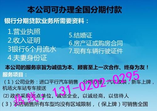 公司介绍:本公司一直以诚信为主 顾客至上的理念经多年 本公司办理全国分期付款业务为方便您购车,我公司现已成立银行分期部门,与各大银行建立合作关系,让贷款变的不再艰难,让您合理的利用自己的资金,让您更快的驾驶上您心仪的座驾!