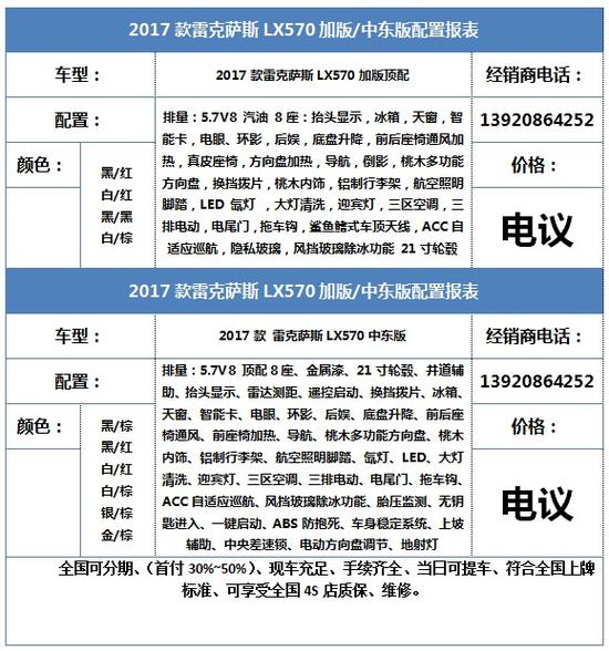 配置:17款 雷克萨斯LX570 加版 白/红 配置:8座 21轮 全景天窗 LED灯 电动调节外后视镜 (可加热 自动折叠 防眩光 倒车自动角度调节 记忆功能 摄像头)隐私玻璃 前雨量感应式雨刷器