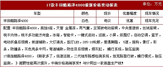 2017款丰田酷路泽4000实现了公路行驶和越野性能的最佳结合。不仅在越野路面上有着出色的车身刚性,其隔音性能与行驶表现也比普通SUV好不少。4.0升发动机提供了磅礴的动力表现,为您的出行带来打造更多的利刃。