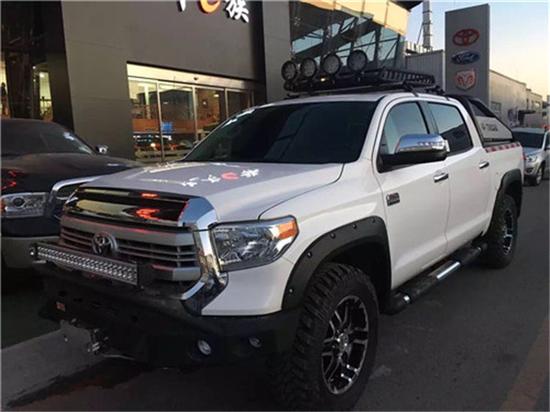 ; ;外观方面:17款丰田坦途,四门五座,宽大硬朗的车身,粗犷有力,凸显美国车的风范,前脸明显外张的挡泥板以及前突的坚固格栅尽显强悍风格。硕大的前灯像是瞪大了的牛眼,所有的部件在坦途上面似乎都成倍放大,狂野气息昭然若揭。新款坦途的一个亮点之处,是它的外后视镜具有转向指示功能。