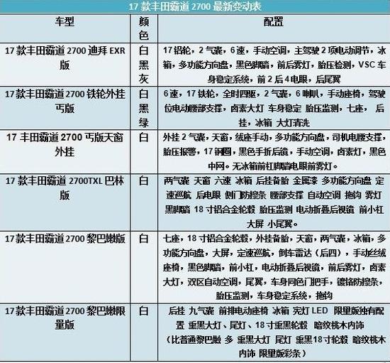 ;17款中东霸道2700最新价格。低到让你心动的价格。新款丰田霸道2700最新价格,丰田霸道2700参数配置及内饰,丰田霸道2700车型怎么样。既然选车所要考虑的关键点已经捋清,那么我们也就没有必要再摇摆不定,那些同价位中动力更强、安全配置更高的车型绝对是正确选择。2017款丰田霸道2700霸气英姿,速度快、反应最灵敏。更加迷人的风度,为它肌肉感十足的外观赢得 了更高的回头率。独特设计风格更显时尚与运动气质,而一系列贴心且有针对性的功能,让车主畅享愉悦体验。