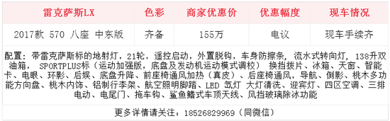 2017款雷克萨斯LX (配置|询价)570外观宽大的前格栅和边角箭头设计体现雷克萨斯设计风格,发动机盖上与众不同的特征线条透射出力量感,特征线条融入保险杠和下方进气口,呈现出进取之势。重新设计大投射头灯,在结实车头加入许多先进要素。前挡泥板上的轮廓线条提升新款LX高端形象,同时轮罩拱为简洁车身增加坚固耐用元素,踏板和车身贴得更近,整体外观浑然天成。更多详情请关注:18526829969(同微信)