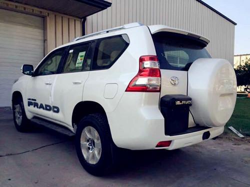 17款中东版丰田霸道4000的后挂备胎上带有PRADO字母,可以改装成字母刹车灯,霸道带有尾翼,尾翼上也带有高位刹车灯,主位刹车灯采用了LED光源。