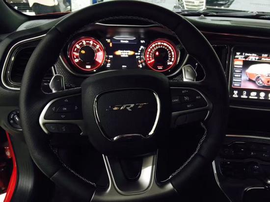 内饰方面:Hellcat配备平底方向盘,仪表盘采用复古设计,但大部分是彩色液晶显示,中控面板配备的8.4寸屏幕集成一个优秀的系统,用户可以在上面调校车辆参数,比如变速箱挡位尺比、直线加速弹射起步、G力设置、比赛计时等专业数据。
