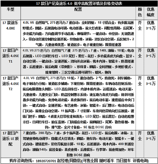 近日,17款尼桑途乐4.0中东版现车到港,天津愿景浩祥汽车销售有限公司九月最新报价优惠,多款配置颜色可选。17款日产途乐满足越野爱好者长途跋涉,穿沙,穿越,只是低调的它掩盖在了陆地巡洋舰和帕杰罗的辉煌之下。17款尼桑途乐4.0标配中东版在越野行驶时,悬架系统能够发挥最大行程,不会像防倾杆那样限制车轮行程,从而使所有车轮保持紧抓地面,同时又保持车身平稳。17款尼桑途乐4.0中东版版最低报价配置,对这款车感兴趣的朋友们不妨进一步关注一下。购车咨询热线:18920720701赵经理(同微信)(可售全国 随时看车 当日提车 详情电询)