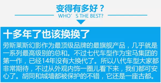 幻影 (配置|询价),作为劳斯莱斯旗下最高端的车型,自2003劳斯莱斯归属宝马集团后,就一直没有更新换代过。仅有的只是一次次的改款和限量版。14年后,第八代幻影终于和大家见面了。