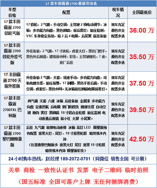 本公司主营中东版丰田陆地巡洋舰全系现车,兰德酷路泽系列,(4000,4500,4600,5700)普拉多 (配置|询价)系列,(2700,3000,4000)配置齐全颜色多选,价格透明,手续齐全,自家车源,直销批发零售,诚诏全国各地经销商,加手机号微信了解更多更新优惠行情,购车咨询热线:189-2072-0701 赵经理(同微信)(可售全国 随时看车 当日提车 详情电询)