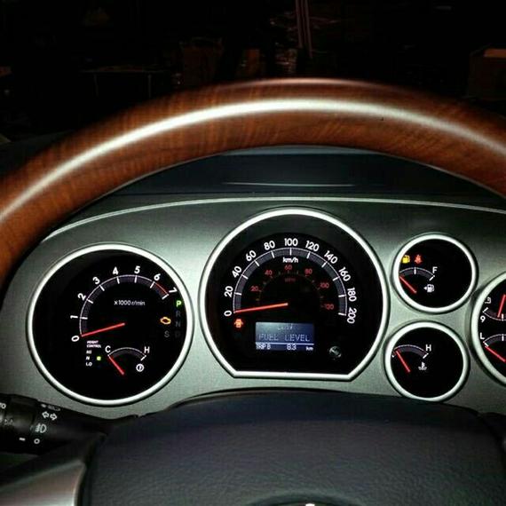 2017款丰田红杉仪表盘的样式没有变化,依旧分为5个独立显示区,转速表、时速表、油量表、水温表、电池/机油表分置其中,黑底白字再加上红色指针,清晰易读,镀铬装饰则提升了精致感,同时,驾驶员还可以通过双闪灯下面的按键查看行车电脑显示屏的内容,不过由于是美规车型,所以行车信息全是英文显示。