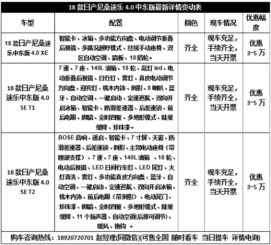 目前18款日产尼桑途乐Y62现车充足,多款颜色可选,配置丰富,关单商检,手续齐全,可售全国,随时看车(库房现车)当日可提,购车有好礼,全国可办理分期付款更多优惠请致电佳世鹏程国际贸易有限公司平行进口汽车经销商,日产尼桑途乐想想在车水马龙中驾驶着这么一辆大家伙会是一个什么样的感觉。对这款车感兴趣的朋友们不妨进一步关注一下。具体价格请详见下表:
