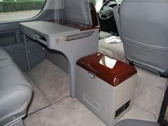 5、驾驶舱隔板:驾驶舱隔板半封闭式,包意大利NAPPA真皮。32寸液晶显示器。 6、车载冰箱:尼桑碧莲原装冰箱,可冷冻冷藏,冷冻可达零下18度,冷藏保持5度。3层式车载冰箱罩带雨伞支架。冰箱盖桃木纹装饰,箱体包意大利NAPPA真皮,箱底仿麂皮绒色。