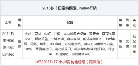 近日,在天津祥瑞通国际贸易有限公司了解到2016款丰田塞纳四驱Limited顶配现车到店,天津现车销售亲民价热惠,一手贸易商拒绝中间加价真实车源手续完善,配置丰富手续正规,更多优惠信息请致电商家,为您提供最新最快的行情。