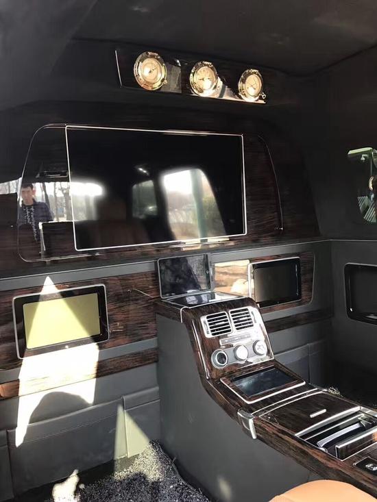 细节方面:路虎揽胜皇家一号加长版配备了BOSE5.1殿堂级影院系统,喝酒K歌绝对毫无压力。后排配备有鞋托,车内底板全部为豪华游艇木装饰。由于是4座的设计,所以说后备箱腾出了比较大的空间,说到底,加长路虎揽胜皇家一号,还是一个豪华商务越野车,最主要的功能设计都安排在了后排。