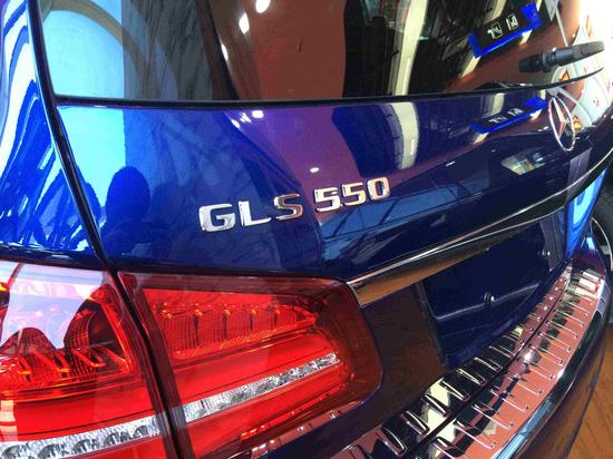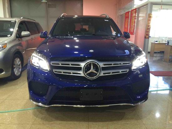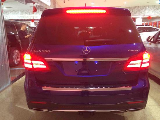 车型:17款奔驰GLS550 蓝/黑配置:1、标配豪华版(全景天窗、电吸门、智能卡、、无钥匙进入启动、加热前后座椅、二排电动、三驱空调、哈曼卡顿音响、多媒体接口),运动包(21寸AMG轮毂、AMG大包围)