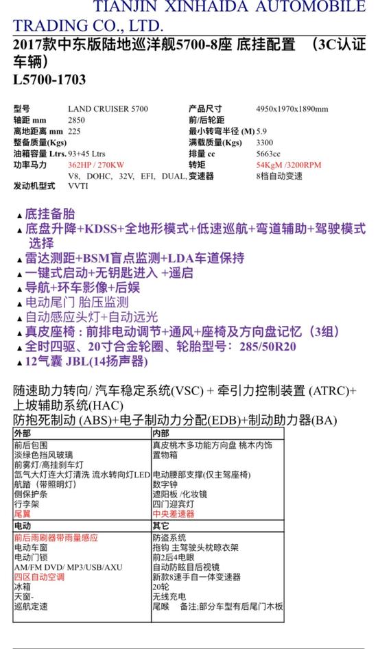 [天津港口行情]在天津远创之星国际贸易有限公司了解到2017款丰田酷路泽5700现车到店,提车更有豪礼相送,配置手续齐全,更多优惠信息请致电商家,为您提供最新最快的行情。