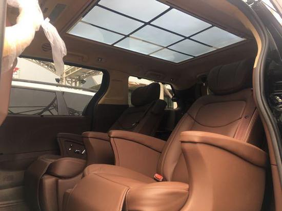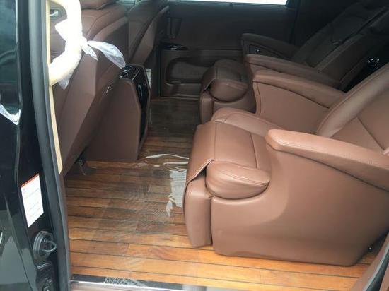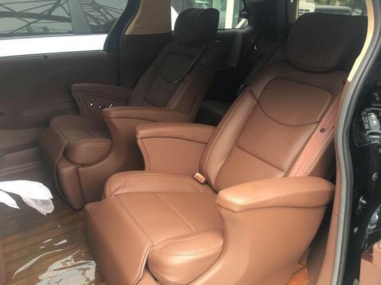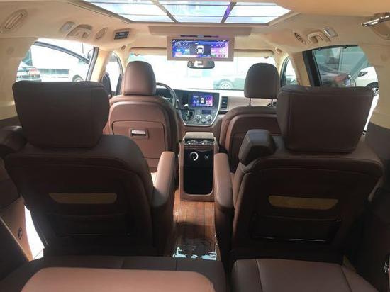配置:塞纳四驱改装版,黑棕//白棕 蒙娜丽莎大包围可选装 配置: 双侧电动门; 前排座椅加热; 第二排座椅通风加热按摩; 第二排小桌板; 三区空调; 倒车影像; 后排隐私玻璃; 多功能方向盘; 定速巡航; 行李架; 间歇式雨刷; 电动折叠后视镜; 蜂窝中网; 全车镀铬装饰套件; 18寸轮毂; 远近光一体式LED大灯带蓝色恶魔眼; 全车真皮座椅; 打孔真皮+钢琴烤漆实木方向盘; 真皮中控台; 五门真皮; 翻毛皮内顶; 木质地板; 暗夜星空顶及氛围灯; 迎宾踏板及全车氛围灯; 折叠式行政桌板; DVD后排娱乐系统; 内置12L 温控冰箱中央扶手箱; 电动后尾门