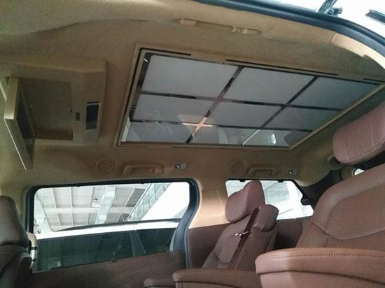 2排空间超大,加装了玻璃星空定,17寸吸顶DVD,浅米色的鹿皮顶,让乘坐者有一个舒适的环境。