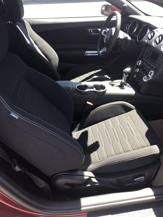 内饰方面:2017款福特野马车厢内部铝质饰件更加让人感受到野马的技术之精良。三幅方向盘直径很大,握在手里就会有种掌控一切的感觉。宽大的真皮座椅和门板整片的塑料都是绝对的美国车范儿。内饰简单中却透露着一种原始的粗犷和令人上瘾的刺激感。