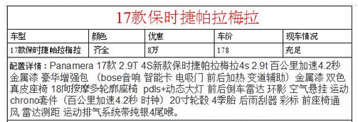 [天津最新行情]近日,在天津宇晟行国际贸易有限公司了解到17款保时捷帕拉梅拉天津现车到店。店内现车销售热惠不散场,超值爆惠限时秒杀,配置丰富手续正规,更多优惠信息请致电商家,为您提供最新最快的行情