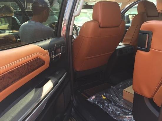 17款丰田坦途1794版加版中控区被银灰色的面板划分为驾驶区与乘坐区,在宽大的车身内排挡杆更为接近驾驶员更便于操作。金属装饰条及桃木装饰的点缀也为整车增添了几分豪华感,后排座椅与前排座椅之间的距离相当充足,给予乘客宽敞的乘坐空间。整个内饰的感觉相比于我们熟悉的一般车辆,有一种从6平米的出租房一下子进入大礼堂的感觉。