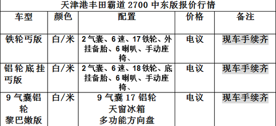 近日小编走访到天津远洋佳诚汽车贸易公司了解到本公司新到17款丰田霸道普拉多 (配置|询价)2700中东版现车手续齐,颜色均有,本公司承诺为您提供的每一辆车都是经过海关的严格检验的,质量有保证,没有走私车,二手车,水车。让您买的放心,舒心,安心。