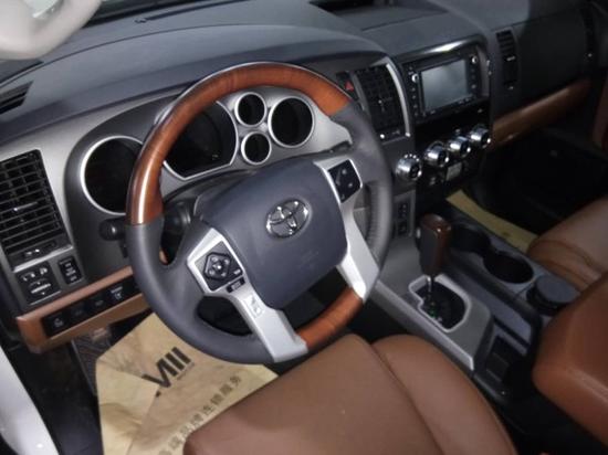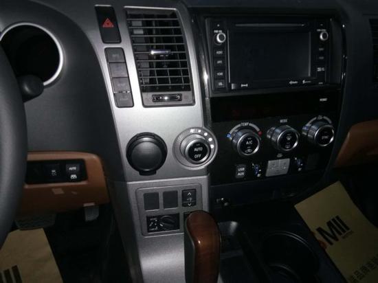 内饰方面:新款丰田红杉5700内部空间采用了符合人体工学的设计理念,同时还应用了高品质的内装材质,中控台被银色和黑色分割成了两部分,从而让驾驶者更方便操控。丰田红杉带有桃木内饰装饰,包括细节的方向盘和换档把都是桃木的,而且带有原装的大屏导航和倒车影像,带有底盘升降控制。多功能真皮桃木方向盘可以控制定速巡航音量加减以及蓝牙电话和ACC雷达测距系统。主副驾驶都带电动调节,座椅带有前后加热和前通风功能。