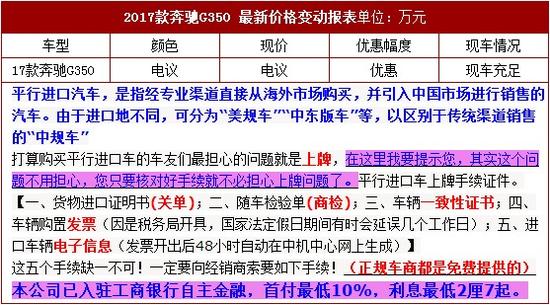 更多详情咨询 请见新闻末端2017款奔驰G350 3.0T引擎盖与车体链接的锁扣也锋芒毕露,贯穿腰线的防擦条增强了整车侧面的力量感,对于侧面门板的保护作用也不言而喻。车头前熠熠生辉的三叉星徽,不仅代表着历经百年的造车荣耀,更代表了卓越的品质和精致的工艺。