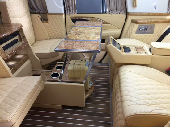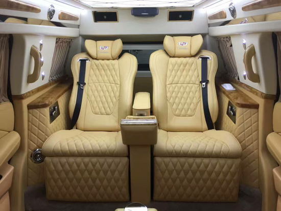 2017款凯迪拉克总统一号内部为六座设计,前排为电动折叠座椅,座椅收起跟中间多功能实木吧台融为一体,形成更大吧台。后排为2个独立的电动按摩座椅带8向自动调节功能。乘客舱所有的电器全部集成在后排座椅中间小吧台的屏幕上,操作方便简单。全车都采用酒红色真皮包裹,档次和豪华程度无可比拟。