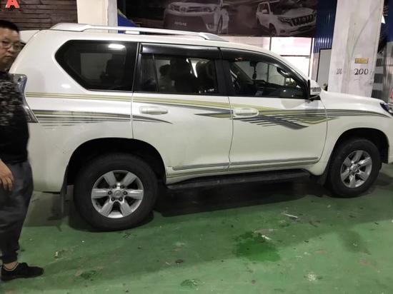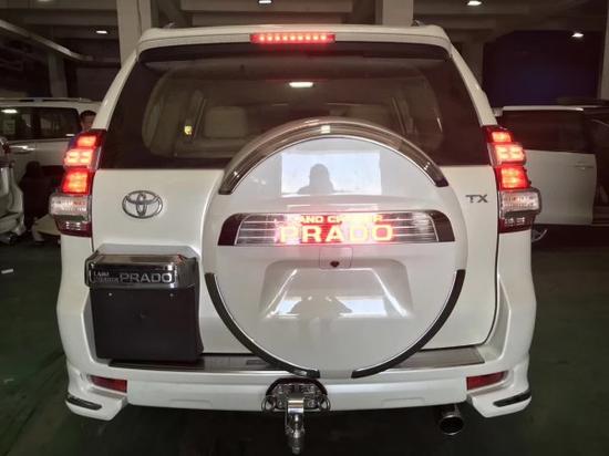 车身后部为备胎装上了备胎罩与带灯的镀铬贴条,尾部加上了包围与尾喉,最重要的就是这个脱钩,也叫流氓钩,这个东西时时刻刻的提醒后车,不要妄想追尾我的丰田,就是这么霸道!