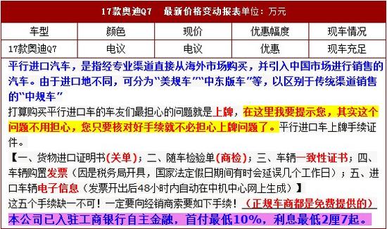 为了给厂家走量,为了给回馈外地客户一直以来长期支持,特此推出17款奥迪Q7加版3.0T全系车型促销,现车甩卖价,全国可上牌 外地客户当天进店便可提上现车 无需等待 无需预定。