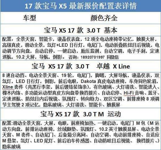 配置表详情内饰方面: 全新2017款宝马X5采用中央控制器和控制显示屏,同时独特的i-Drive系统可以提供诸多信息,另外,新车车内将可能采用全新的信息娱乐技术,并将增加多个安全辅助系统,使其具备优异的操纵灵敏度和操纵稳定性。宝马X5内饰的科技感十足,宝马的品牌形象本身在豪华品牌中就属于偏运动一些的,科技感虽然不能算得上数一数二,但也绝对够驾驶操控使用的。宝马X5操控区域依旧沿袭宝马X系专属设计理念,内装不仅格调优雅,还具备众多功能。真皮座椅如同量身定制般为身体提供恰到好处的支撑。