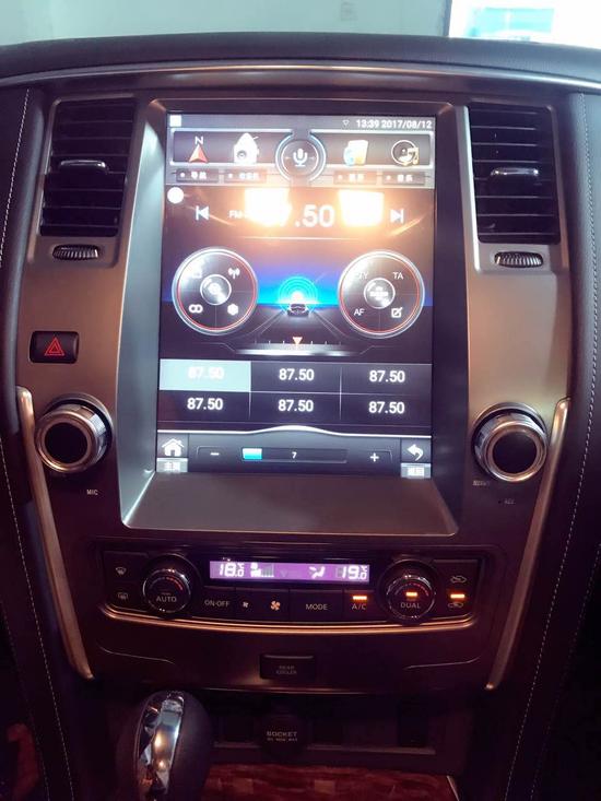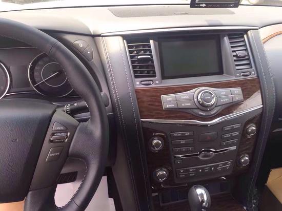 日产尼桑途乐在内部整体采用了深色调的颜色搭配,带来具有高贵感的内饰氛围。同时,该车中控台及方向盘运用了大量的皮质包裹,在质感的营造上也较为出色。此外,这款车在换挡杆周围等区域融入了木纹装饰,这也相应提升了其内饰整体的豪华感。