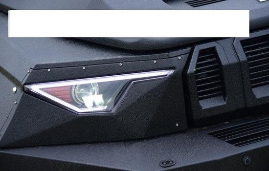怎么样?造型是不是很夸张?其实不然,让我们一起来一层层的揭开它的面纱,这期这款捍卫者是在BJ80基础上进行的改造,把所有的车壳子去掉,换为2.3毫米的钢板,另外为了应对一些流弹,车身全部为折面设计。另外需要指出的是,这款车全车采用的是美国进口的石头漆,强度特别高,哑光,防刮能力强,小剐蹭根本不会有划痕,有较大撞击的时候全车车漆会整块整块的掉落。日行灯的造型很拉风!