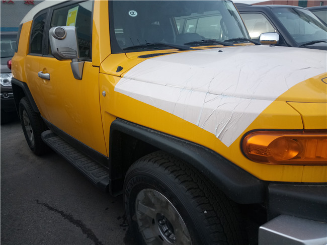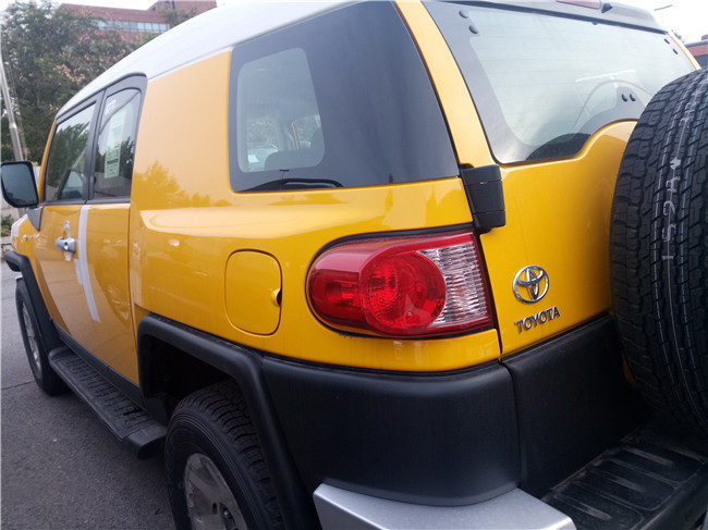 17款丰田酷路泽FJ在许多方面继承了FJ40的经典,比如圆形的前大灯,经典的带丰田标志的车前格栅,笔直的挡风玻璃,别具一格的白色圆浑方正的车顶,车身后部的四分之一车窗以及后部宽大的空间。在尾部的保险杠上设置了深色的踏板,这个踏板承重能力很强,完全可以站上去。