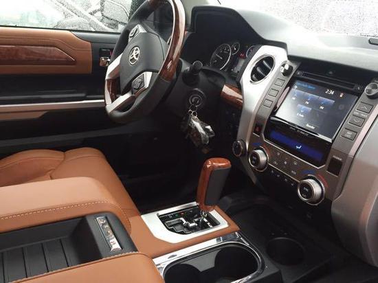 17款丰田坦途1794版皮卡做工十分精致,真皮座椅、桃木的方向盘、动感仪表盘,筒状的仪表盘充满了深邃的意境,又凸显运动色彩,丰田坦途皮卡并不比任何一辆SUV差,它配备了带记忆功能的驾驶员座椅、电动天窗、GPS导航系统、可加热与冷却的前排真皮座椅。新车有5米8的长度,这样的尺寸坦途不仅在公路上能独当一面的风光,在停车位上可能也得需要额外的照顾。内部装饰更接近SUV车型,木质的应用让这辆卡车拥有了几份细腻典雅的感觉。