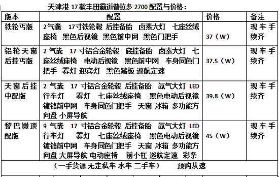 [天津最新行情] 据小编了解到天津港远洋佳平行进口车公司新到大量17款丰田霸道普拉多 (配置|询价)2700中东版,现车手续齐全,版本众多,颜色齐全。所售汽车均为平行进口车,无走私车,二手车,水车。本公司始终以诚信第一,主顾至上。为经营理念一次合作,终身为友。